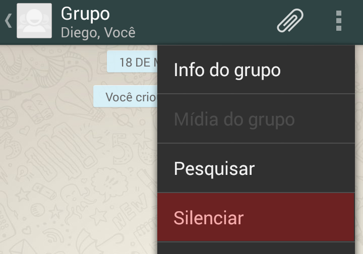 Todo mundo já teve problemas com grupos, sempre há aqueles que conversam o dia todo e seu celular não para de apitar. Muitos acabam abandonando o grupo por isto, mas uma simples opção pode resolver o problema. Dentro do grupo toque no botão de menu de seu aparelho e depois em Silenciar. Escolha o período que deseja silenciar e escolha se quer receber as notificações ou não. As notificações só mostrarão as mensagens no grupo, não emitirá sons.