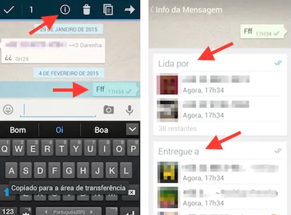 Quando enviamos uma mensagem no grupo e precisamos saber se uma pessoa específica leu nossa mensagem? O aplicativo permite saber informações como quem leu sua mensagem, quem recebeu, horários de leitura etc. Estas informações só ficam disponível para quem enviou a mensagem. Para vê-las toque na mensagem que você enviou e pressione o dedo por alguns instantes (selecionar a mensagem). Toque no circulo com o "i" (Opção info) e terá as informações.