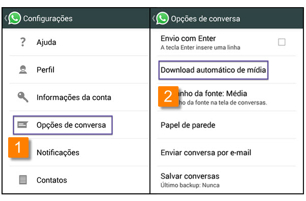 Quem participa de vários grupos sabe como o problema que é receber diversas fotos e vídeos todos os dias e o aplicativo baixa tudo sem você querer. Para evitar que ocupe a memória do seu aparelho ou baixe conteúdo indesejado, temos a opção de desmarcar o Download Automático. A opção se encontra em Configurações > Opções de Conversa > Download automático de mídia. Nesta seção, é possível escolher se você quer que fotos e vídeo sejam baixados somente quando se estiver conectado a uma rede WiFi, nunca ou sempre.
