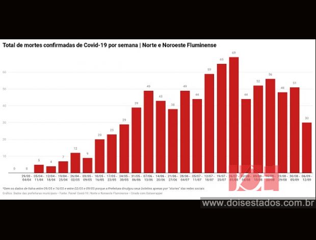 O índice de mortes também sofreu grande queda na última semana. Com o maior número de óbitos da região, Campos teve redução de 43,5%, passando de 23 para 13 óbitos entre os dias 06 e 12 de setembro.