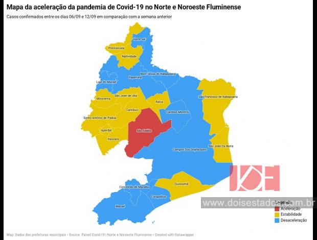 Além disso, entre todos os 22 municípios das regiões, apenas São Fidélis teve aceleração da pandemia na última semana, com 154,5% a mais de novos casos na comparação com o período entre 30 de agosto e 05 de setembro. Ao todo, 12 cidades apresentaram estabilidade e outras nove tiveram desaceleração dos índices.