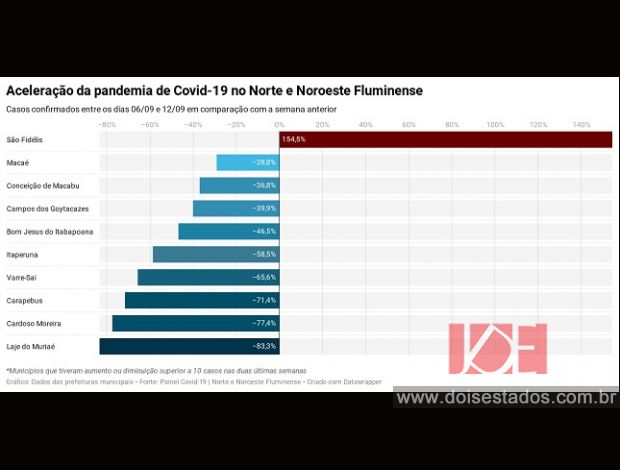 Bom Jesus do Itabapoana, com -46,5% (de 39 para 21 casos), e Conceição de Macabu, com -36,8% (de 38 para 24), completam a lista das cidades com desaceleração. Por outro lado, apenas São Fidélis teve alta no período, passando de 22 novos casos para 56.