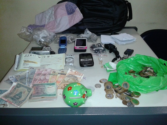 Dentro da mochila, além de grande quantidade de dinheiro em espécie e moedas, havia também celulares, cordões, máquina digital, talões de cheques, dentre outros. Ao efetuar revista pessoal no acusado, foram encontrados ainda cerca de R$ 130,00 em notas escondidas dentro da bermuda.