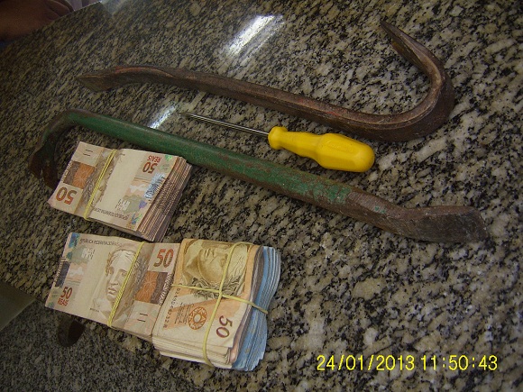 Os acusados Paulo Roberto Correia da Conceição de 29 anos e Anderson Rodrigues Guimarães de 22 anos, ambos da cidade de Tanguá, efetuaram o roubo com a ajuda de mais um comparsa que está foragido até o momento. Com eles foram apreendidos 01 revólver Cal.38 com 05 munições intactas, 02 pés de cabra e uma chave de fenda utilizados no crime.