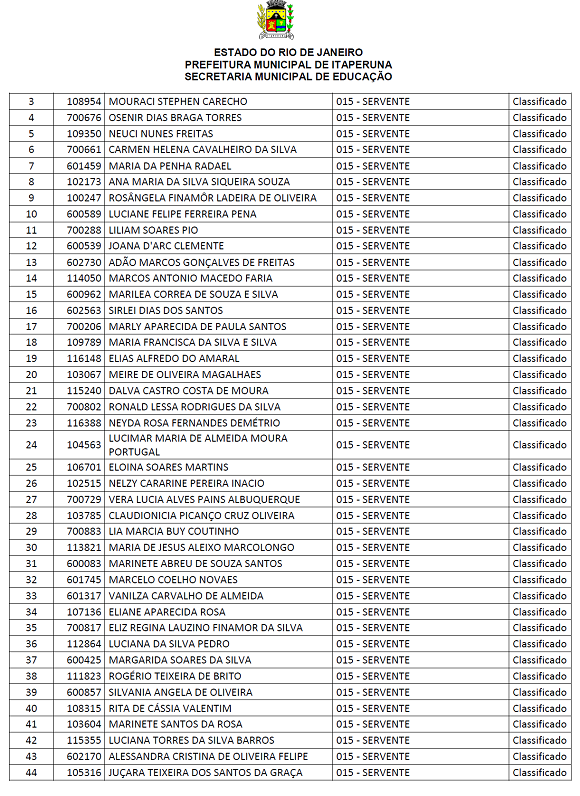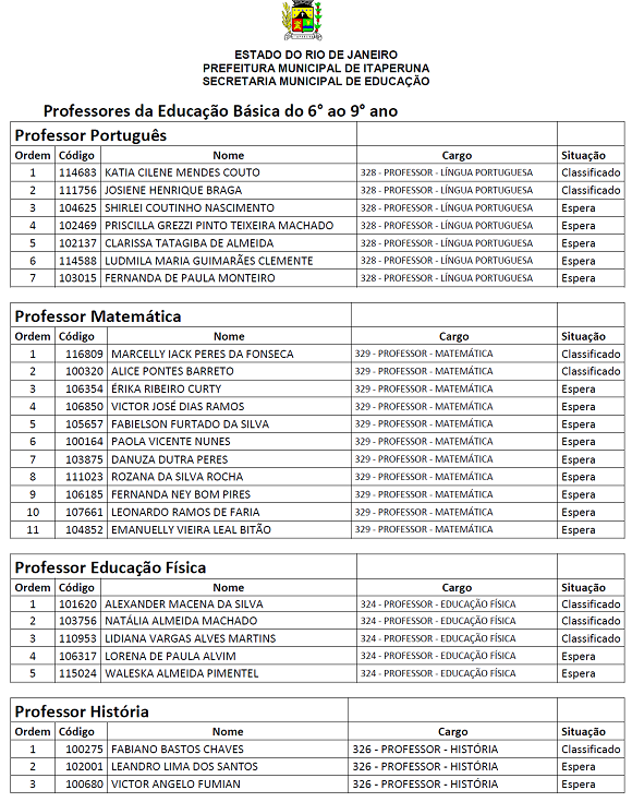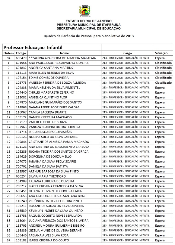 A Prefeitura Municipal de Itaperuna, seguindo orientação do Ministério Público, convoca para assinatura, em contrato temporário, os aprovados no concurso público realizado em 2012. Ainda não foi declarada decisão do Tribunal de Contas do Estado (TCE), mas a Prefeitura convoca em caráter emergencial até que o concurso seja homologado definitivamente. O contrato vai vigorar a partir de 1º de março de 2013.