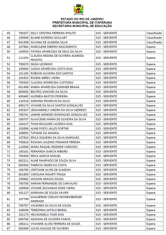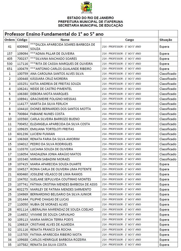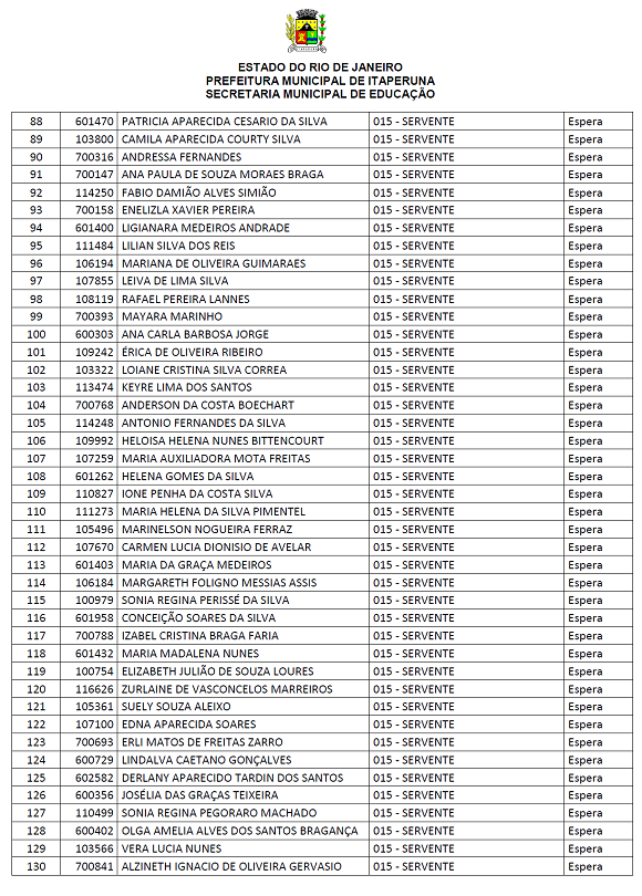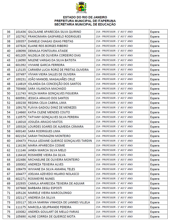 As vagas que estão em nomenclatura de 'espera', são vagas que não foram previstas no edital. Os concursados desta área serão chamados também para atender a demanda da Secretara Municipal de Educação do município.